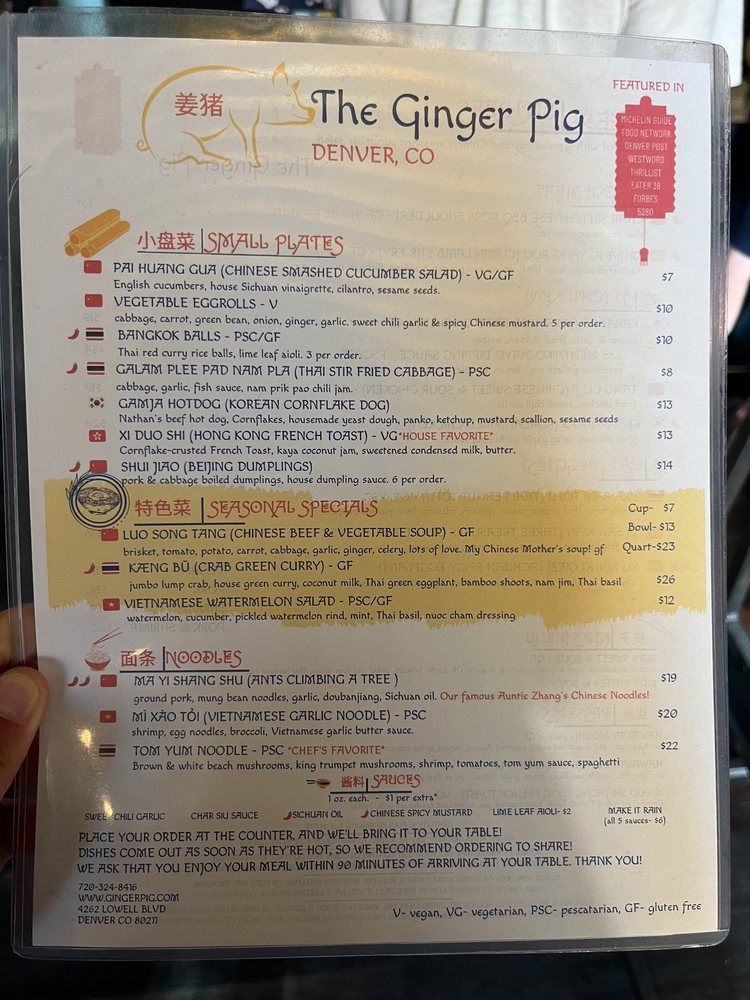 Welcome to Ginger Pig, a delightful fusion of Thai and Chinese cuisine nestled in Denver. This vibrant eatery is known for its casual yet trendy atmosphere, perfect for groups, families, and food enthusiasts alike. With an eclectic menu rotating seasonally, Ginger Pig serves an array of street food-inspired dishes bound to excite your palate.